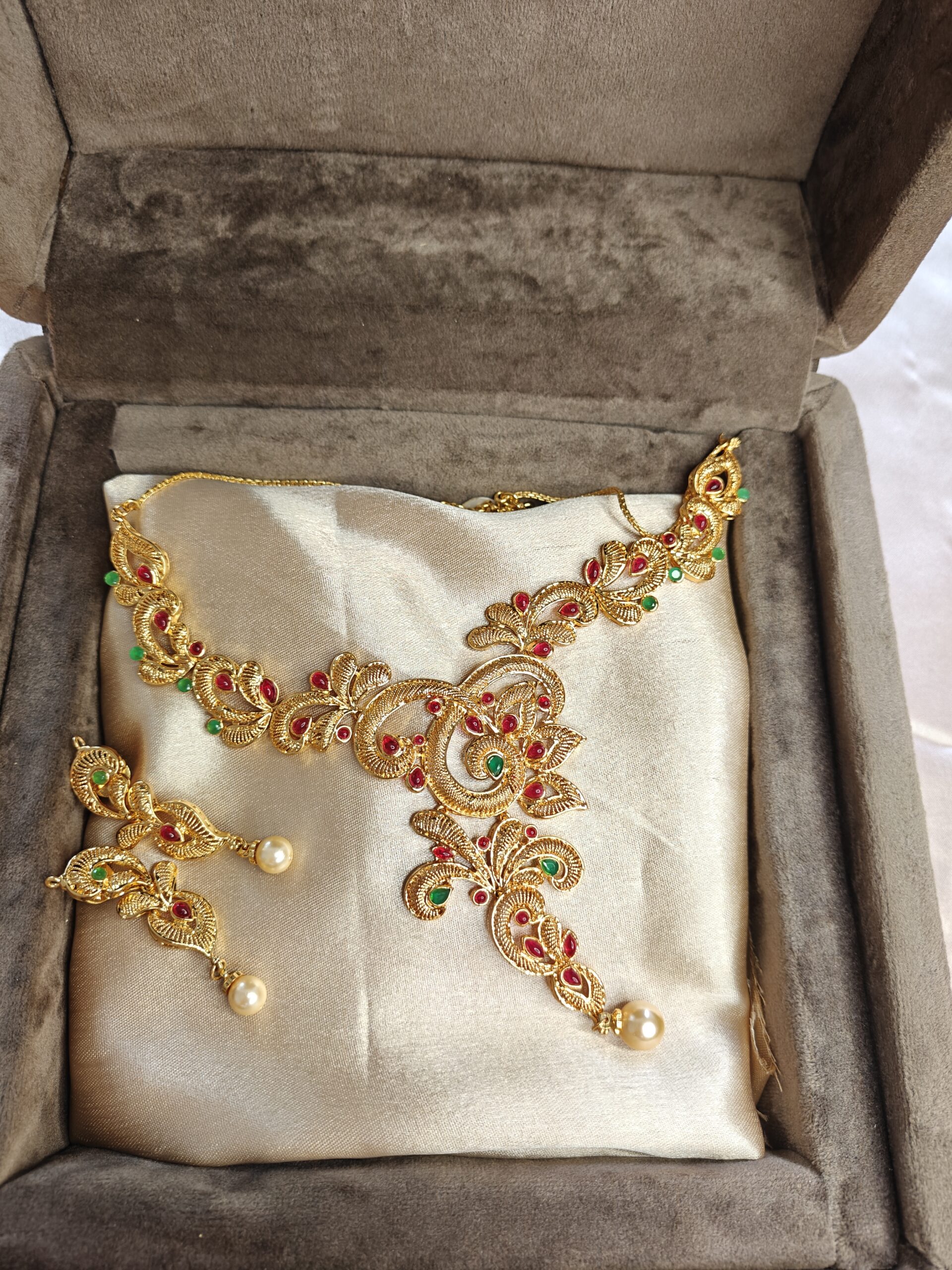 Elevate your ethnic look with this Peacock Stone Gold-Finish Necklace, a celebration of Indian craftsmanship and heritage. Featuring vibrant peacock-inspired stones in rich blues and greens, this necklace is accentuated with a radiant gold polish that mimics the beauty of real temple jewellery.